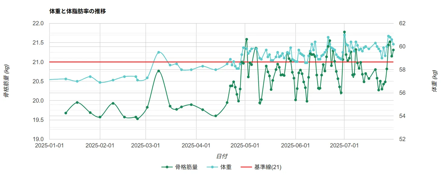 この結果から考えると、骨格筋量が「標準」に入るには、あと1年ぐらい筋トレ継続が必要そうだ……。