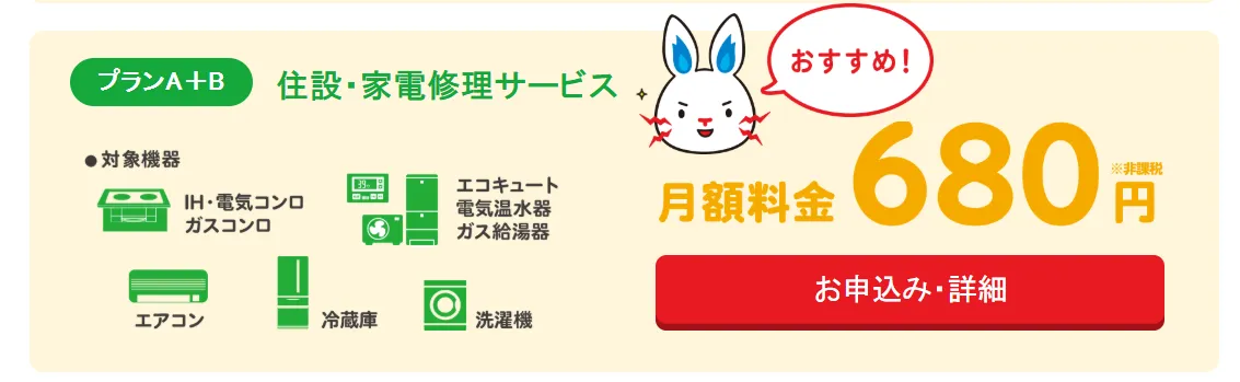 東京電力が「設置・購入から10年以内の対象機器は、すべて修理OK!」な保険を月680円で実施してる。