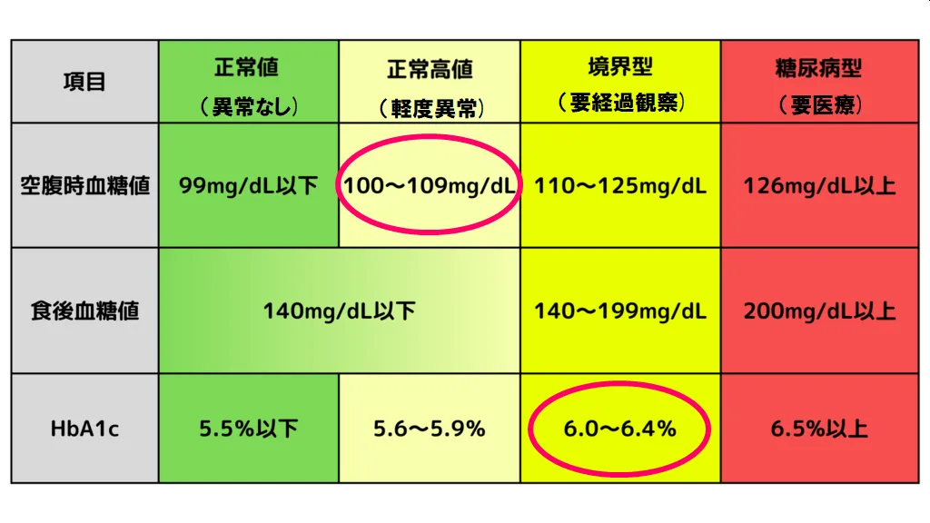 C判定 空腹時血糖値 107 mg/㎗、HbA1c(ヘモグロビンA1c)6.1%