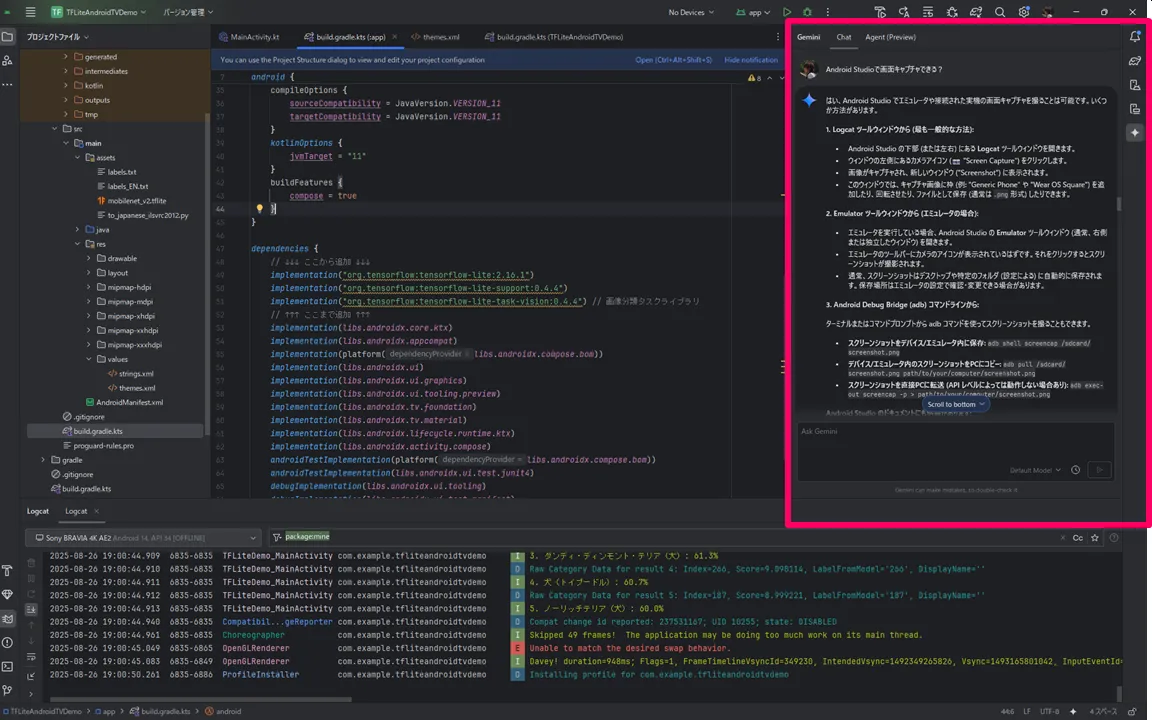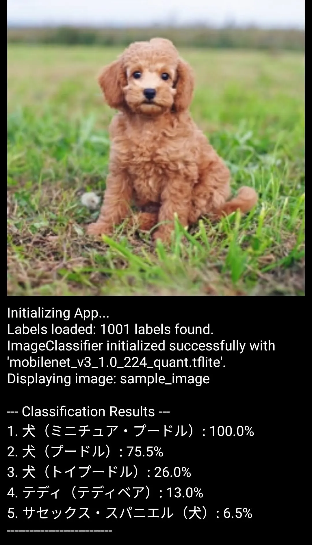 加えて、テスト画像(224×224ピクセル、JPEG、例: 犬 sample_image.jpg)を用意して「res/drawable/」に配置する。