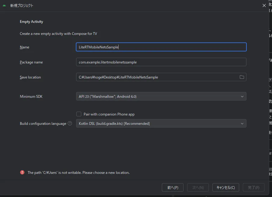 ダウンロードした「mobilenet_v3_1.0_224_quant.tflite」「labels_JP.txt」を「app/src/main/assets/」フォルダを作成して配置する。