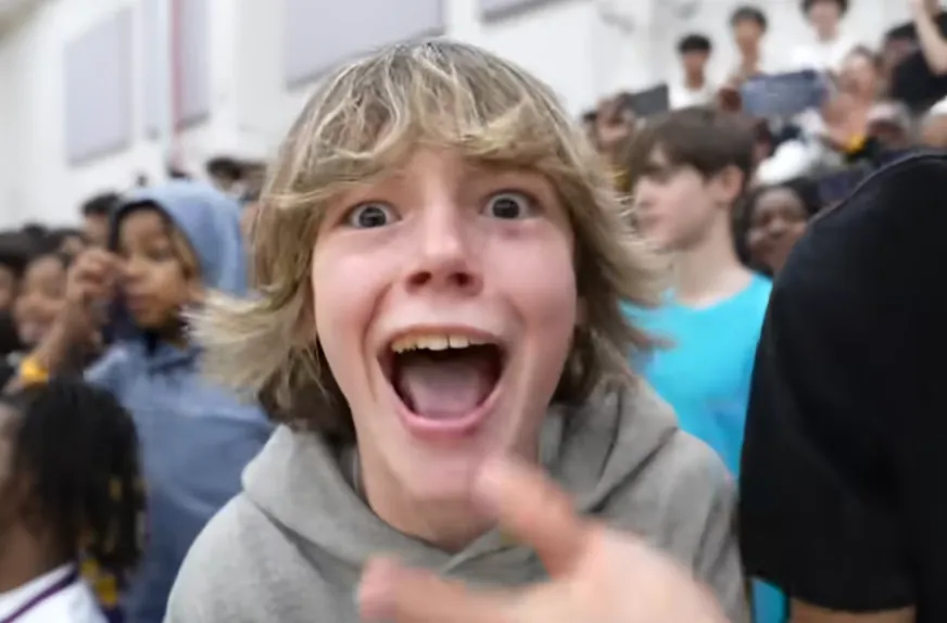 金髪の少年(Maverick Trevillain)がカメラに飛び込んで「six seven!」と叫び、手を上下に振るジェスチャー。