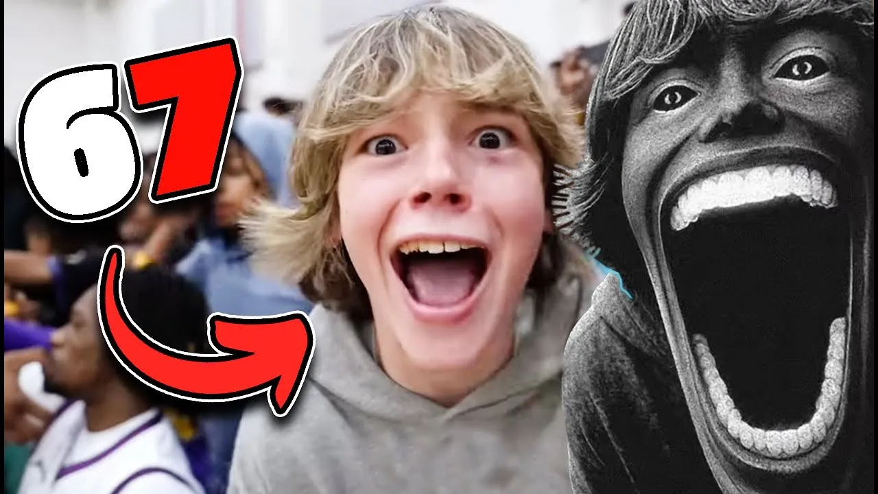 金髪の少年(Maverick Trevillain)がカメラに飛び込んで「six seven!」と叫び、手を上下に振るジェスチャー。