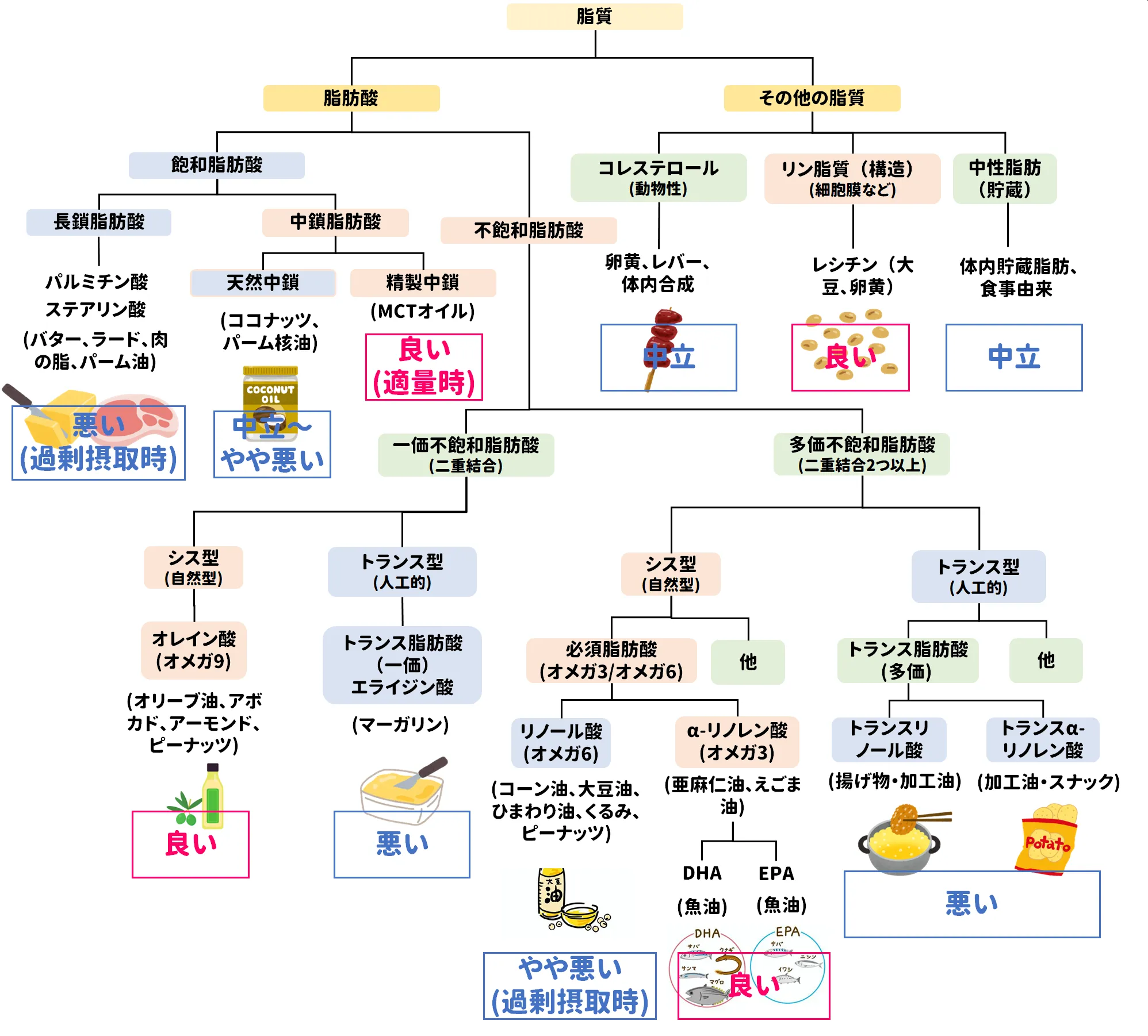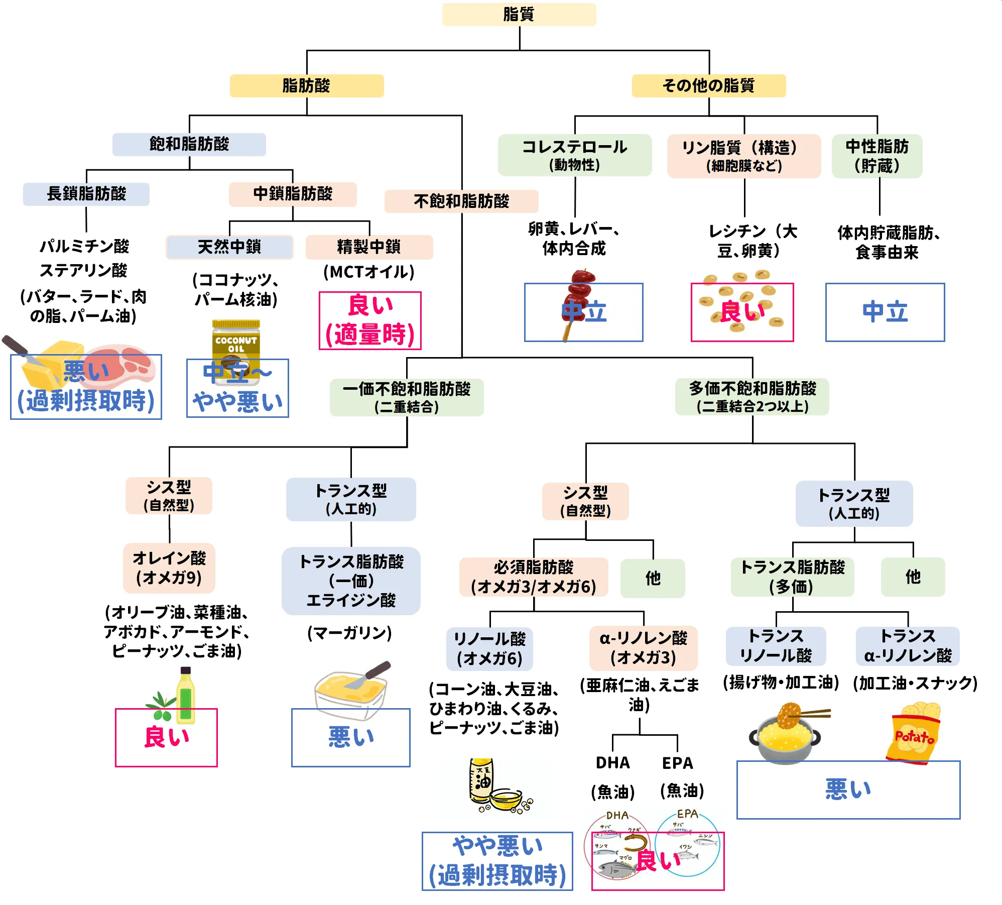 | ┗ 長鎖飽和脂肪酸 | バター、ラード、牛脂、パーム油 | 悪い(過剰摂取時) | LDL↑ → 心血管疾患リスク↑ 適量ならエネルギー源 |