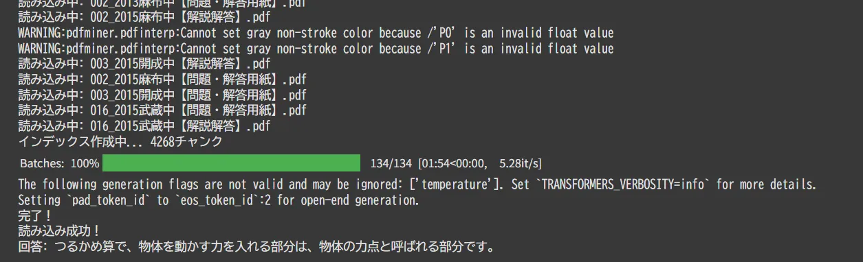 def process_test_cases(test_cases, loader): """テストケースを処理して応答を生成""" for i, prompt in enumerate(test_cases, 1): print(f"\nテストケース {i}: {prompt}") # プロンプトを日本語対話形式に formatted_prompt = f"ユーザー: {prompt}\nアシスタント:" inputs = loader.tokenizer(formatted_prompt, return_tensors="pt", truncation=True, max_length=512).to("cuda") # 回答生成 outputs = loader.model.generate(**inputs, max_new_tokens=200, temperature=0.7) response = loader.tokenizer.decode(outputs[0], skip_special_tokens=True) # プロンプト部分を除去 answer = response.split("アシスタント:")[-1].strip() print("アシスタント:", answer) # テストケース test_cases = [ "日本の首都はどこですか?", "1個70円のりんごと1個30円のみかんを握り潰したら、合計いくら損しますか?", "AIが人間を超える日は来ると思いますか?", "こんにちは!最近の趣味は何?", "富士山が世界遺産に登録された年は?" ] # テストケース実行 process_test_cases(test_cases, loader) |