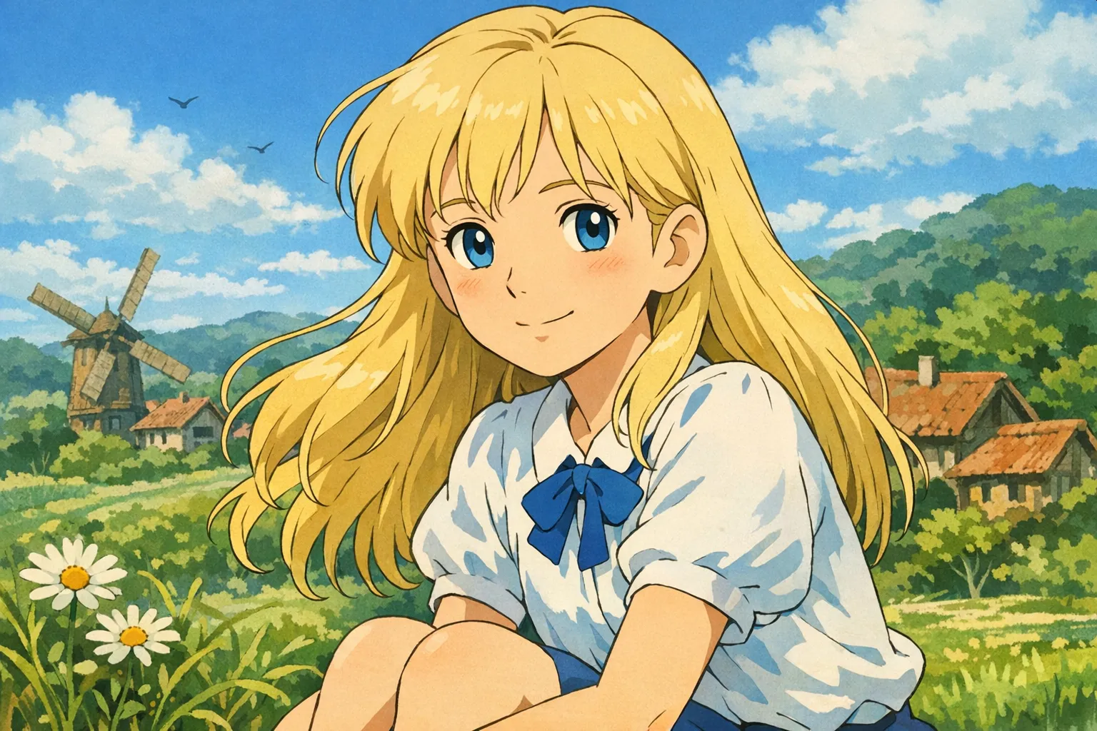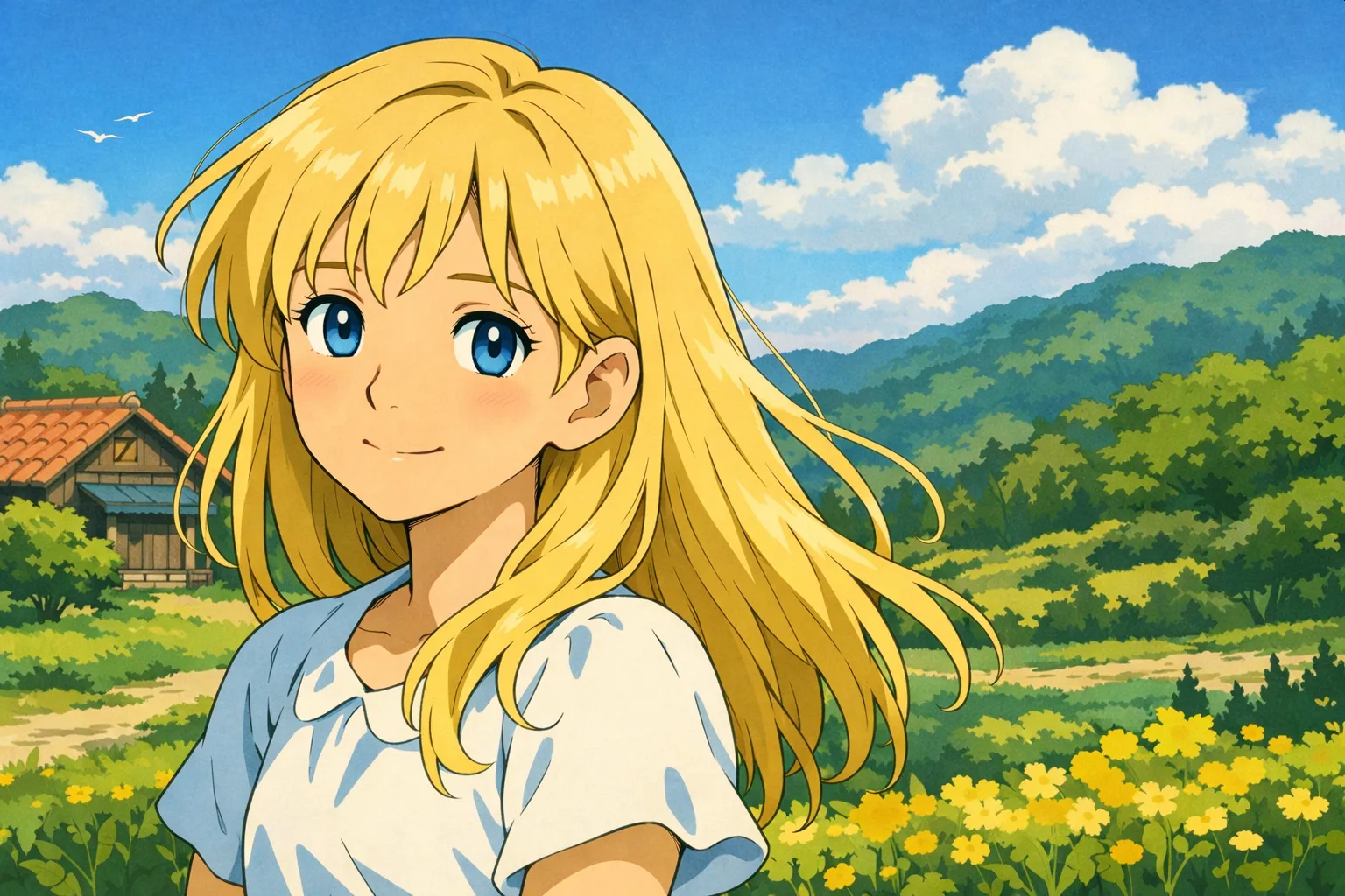 スタジオジブリ風のアニメの女の子、金髪、青い目 イラストを書いて