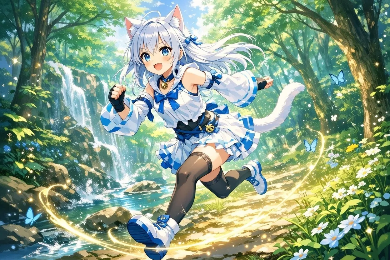再度 Microsoft 365 Copilot(GPT‑5 chat model ベース)を利用して森を走り回る猫耳少女を描いてもらった。