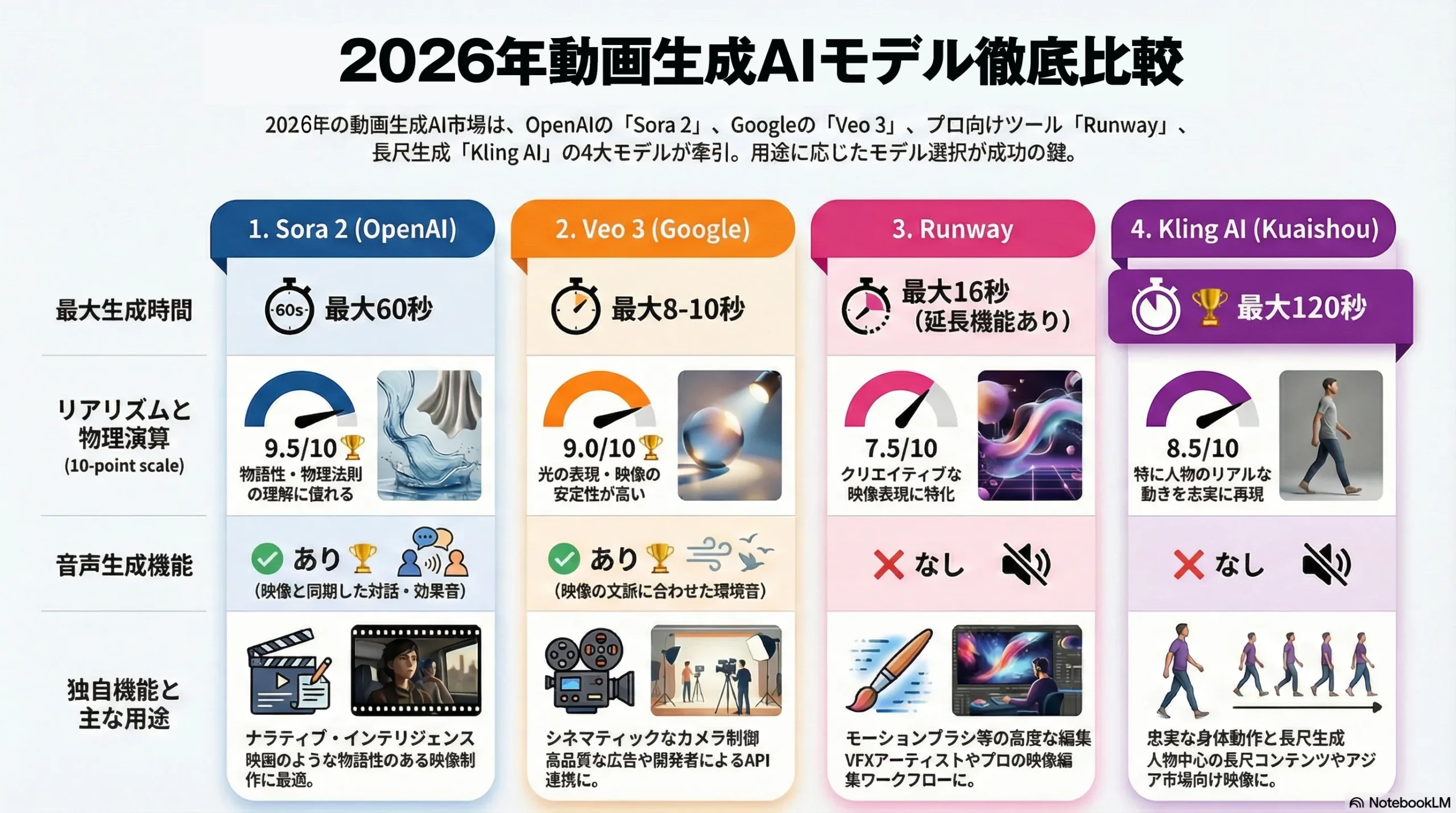 | Runway Gen-4.5 | 2025年12月1日 | 米国。物理法則を理解しリアルな映像を生成できる |