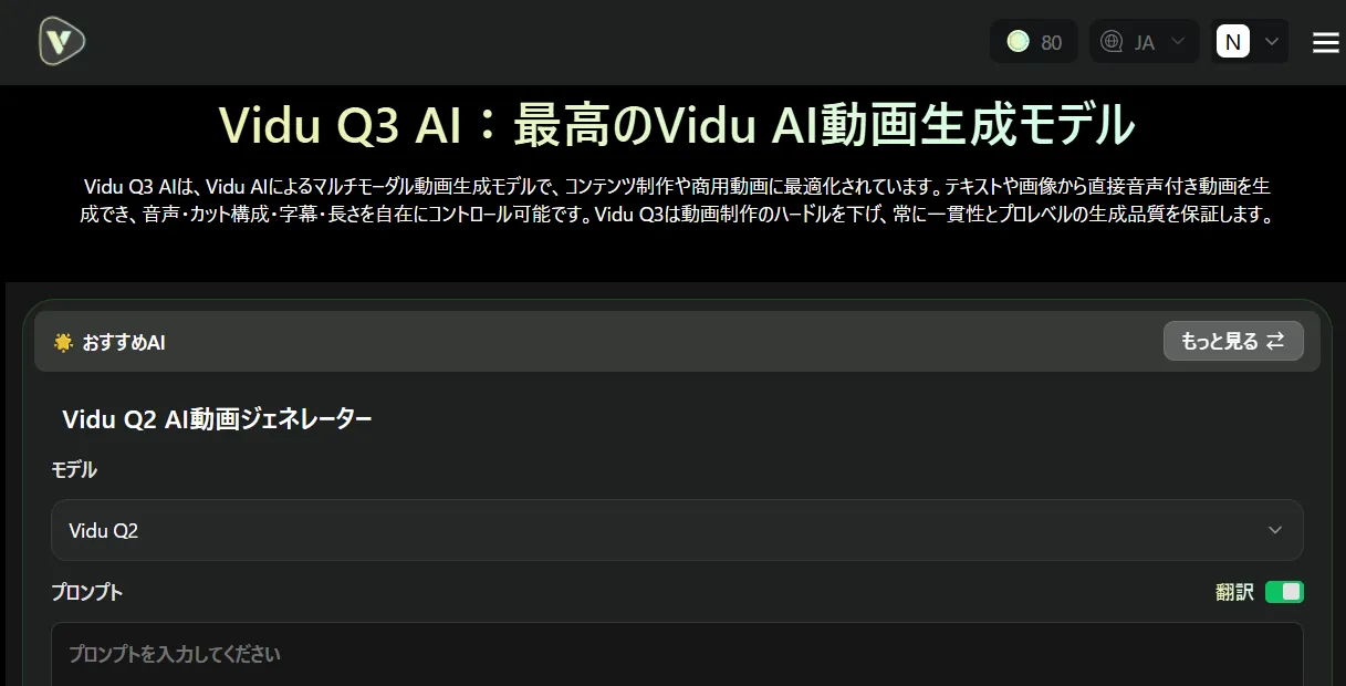 「Vidu Q3」は中国生数科技と精華大学が開発する Vidu シリーズの最新世代モデルで、短尺動画生成における表現力と生成速度のバランスを強化した点が特徴。