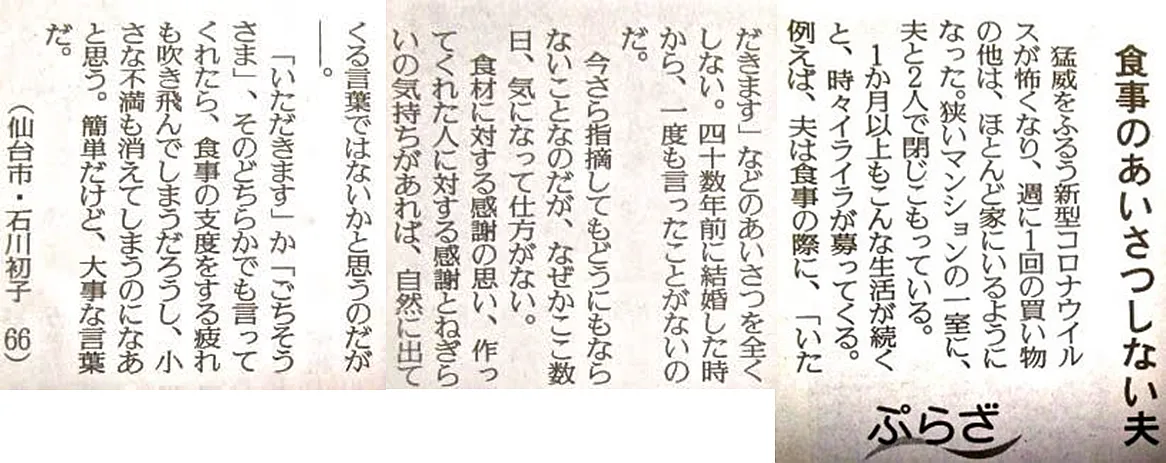 先週の新聞、家庭欄に出ていた読者からの投書「食事のあいさつしない夫」と出ていた。奥様が一生懸命用意した食事に「いただきます」や「ごちそうさま」の挨拶しないという事で、奥様のイライラがつのってきている。そりゃあ、食事を作って出したのに、挨拶しないで黙々と食べるだけでは奥様もうんざりするでしょう。このご主人は「男は『いただ...