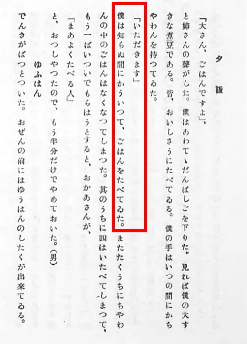 • 1937年(昭和12年) 「(前略) お膳の前へ坐ると、頂きますとお辞儀をするし、お終いになると、御馳走さまといったり (後略)」