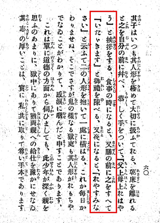 食事の時になると、又膳の前に之をすへてたれまたよ「いたゞきます」と御禮を陳べる