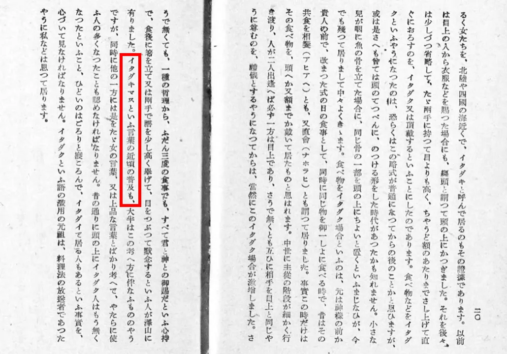 民俗学者の柳田國男も1946年の著書「毎日の言葉 (創元選書)」のなかで「いただきます」が近頃普及したものだと言及している。