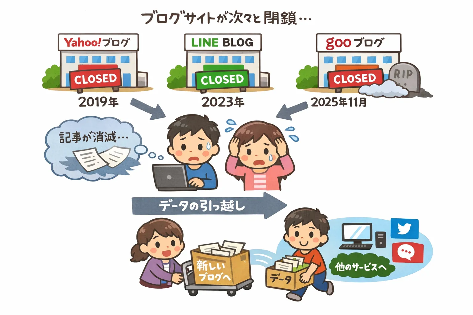 ブログサイトが閉鎖されると、ユーザーが自ら他のサービスなどにデータを移す「引っ越し」をしない限り、記事は消える。