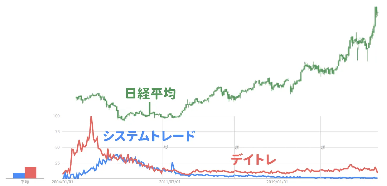 デイトレは2006年1月がピークを迎え2012年7月に減るが最近は多少盛り返している。