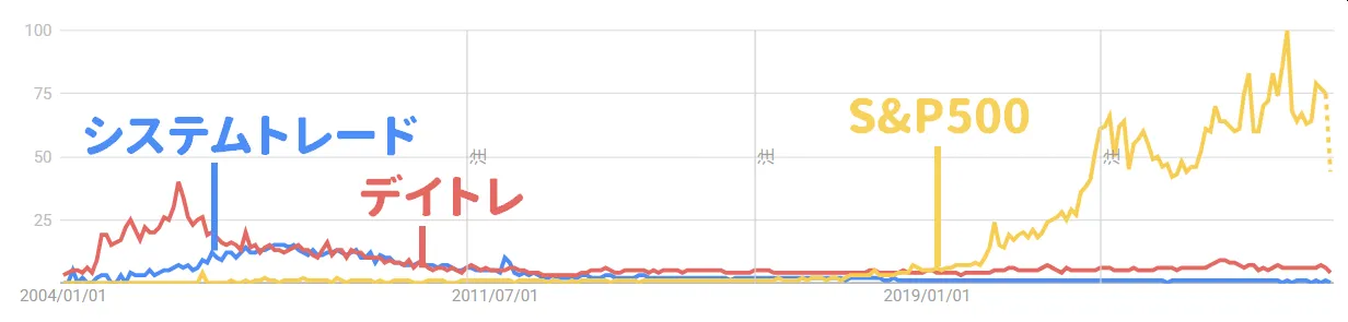 因みに2018年9月に「S&P500」が「デイトレ」の検索数を上回り、それ以降は「S&P500(=インデックス投資)」の人気が圧倒的。