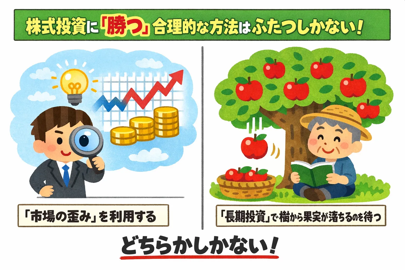 「市場の歪み」を利用するか「長期投資で樹から果実が落ちるのを待つ」か。