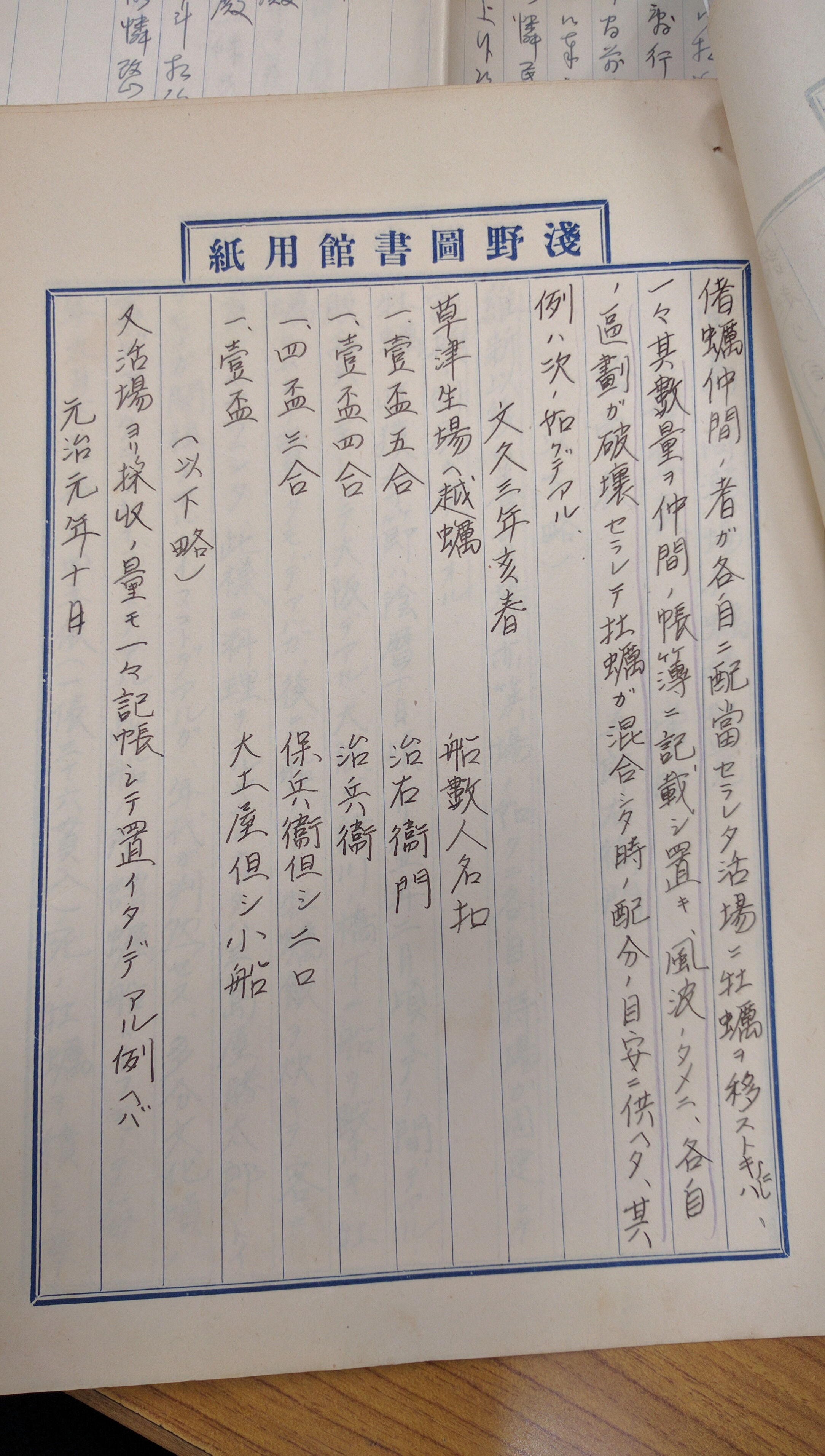 1863(文久3)年、牡蠣仲間の牡蠣が混合した時の配分の目安の中に「四盃三合 保兵衛(40歳)但シ二口」との記載があります(「尚古」広島尚古会の「草津村蠣仲間(二)/新見吉治(明治40年(1907年))」より)。
