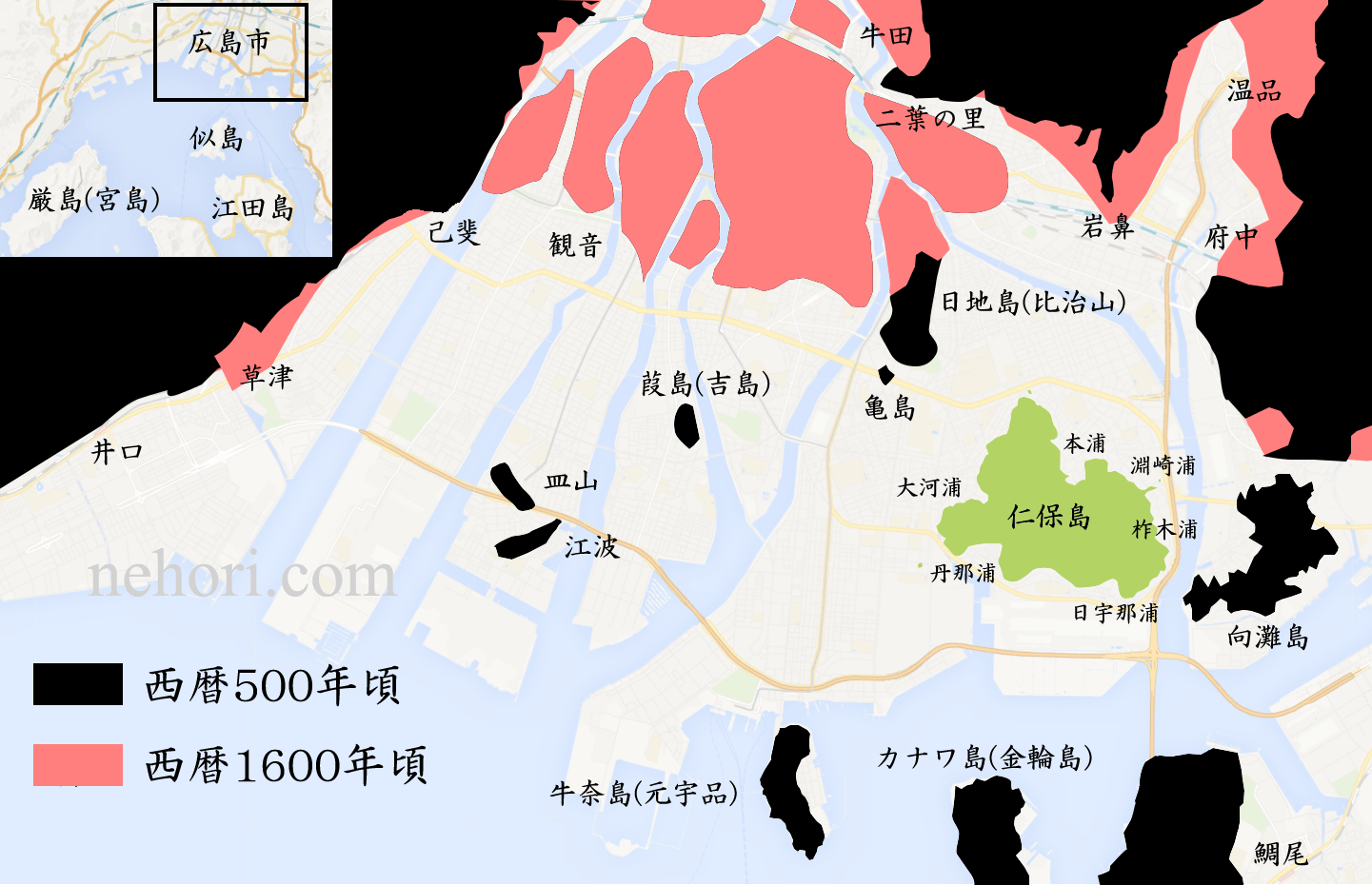 縄文・弥生時代は、広島湾の水位は高く太田川デルタは存在せず、「邇保嶋(仁保嶋)」「ニの嶋」「金輪島」「牛奈島」などの小島が存在するだけでした。